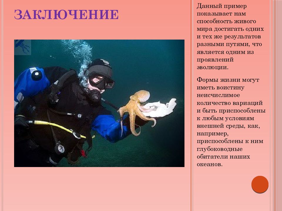 Данный пример показывает нам способность живого мира достигать одних и тех же результатов разными путями, что является одним из проявлений эволюции. Формы жизни могут иметь воистину неисчислимое количество вариаций и быть приспособлены к любым условиям внешней среды, как, например, приспособлены к ним глубоководные обитатели наших океанов.
