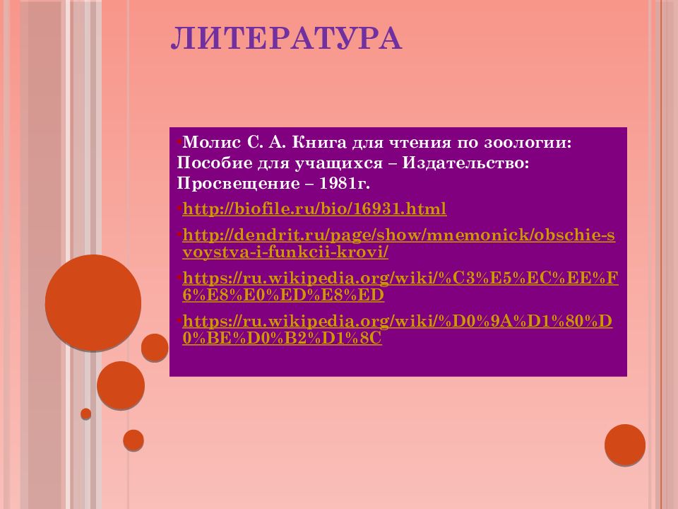 Молис С. А. Книга для чтения по зоологии: Пособие для учащихся – Издательство: Просвещение – 1981г. http://biofile.ru/bio/16931.html http://dendrit.ru/page/show/mnemonick/obschie-svoystva-i-funkcii-krovi/ https://ru.wikipedia.org/wiki/%C3%E5%EC%EE%F6%E8%E0%ED%E8%ED https://ru.wikipedia.org/wiki/%D0%9A%D1%80%D0%BE%D0%B2%D1%8C