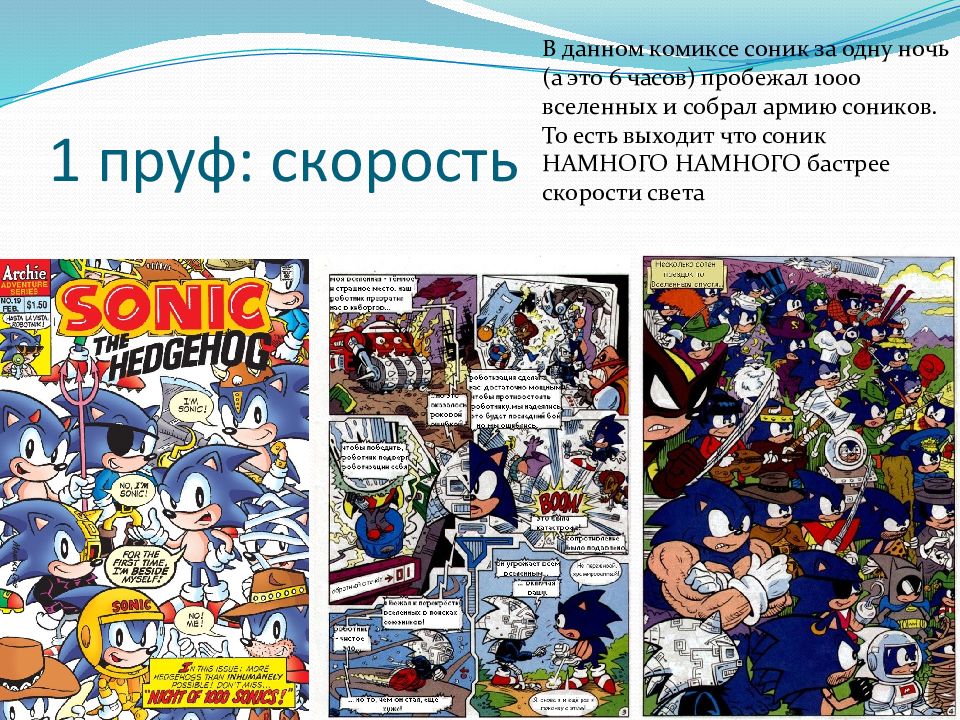 В данном комиксе соник за одну ночь (а это 6 часов) пробежал 1000 вселенных и собрал армию соников. То есть выходит что соник НАМНОГО НАМНОГО бастрее скорости света