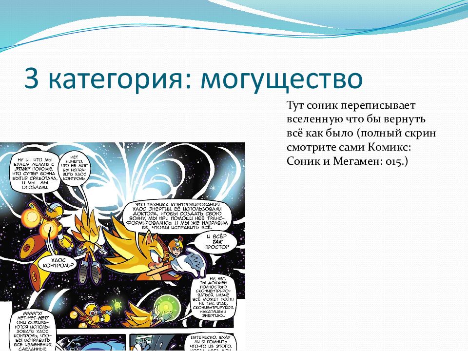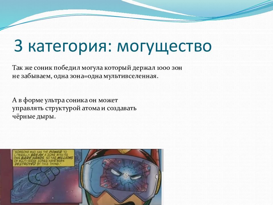 Так же соник победил могула который держал 1000 зон не забываем, одна зона=одна мультивселенная. А в форме ультра соника он может управлять структурой атома и создавать чёрные дыры.