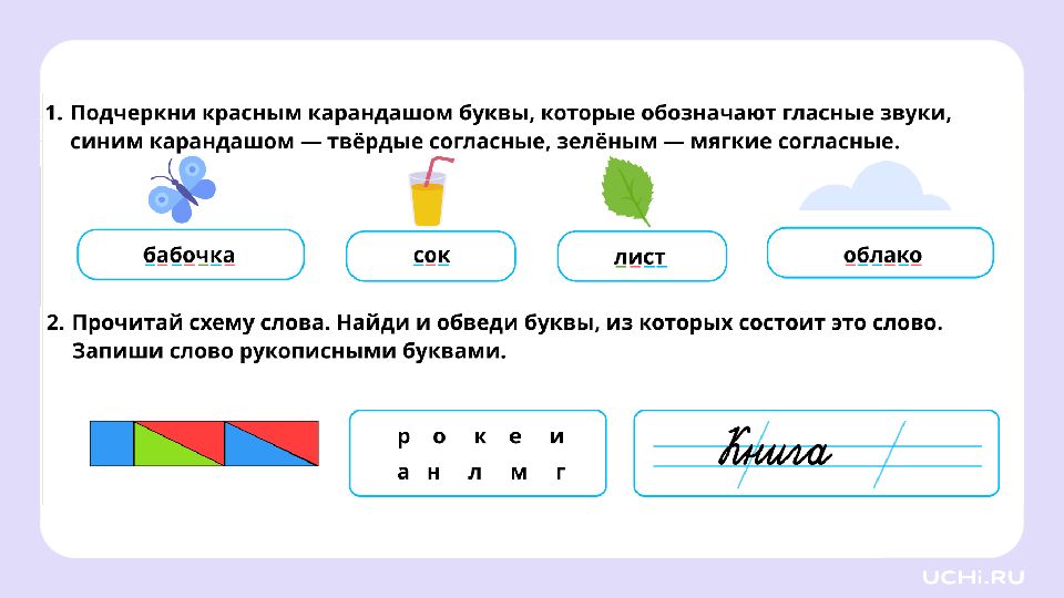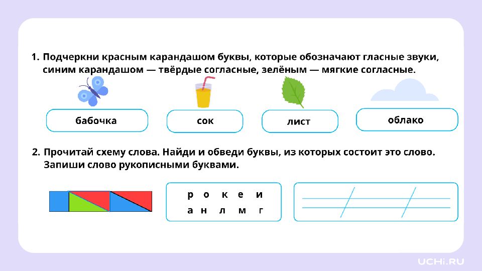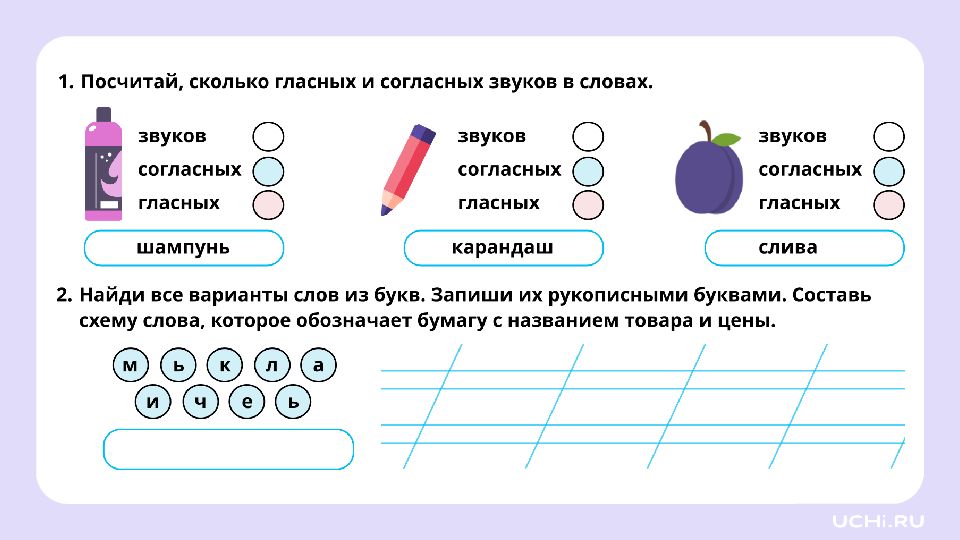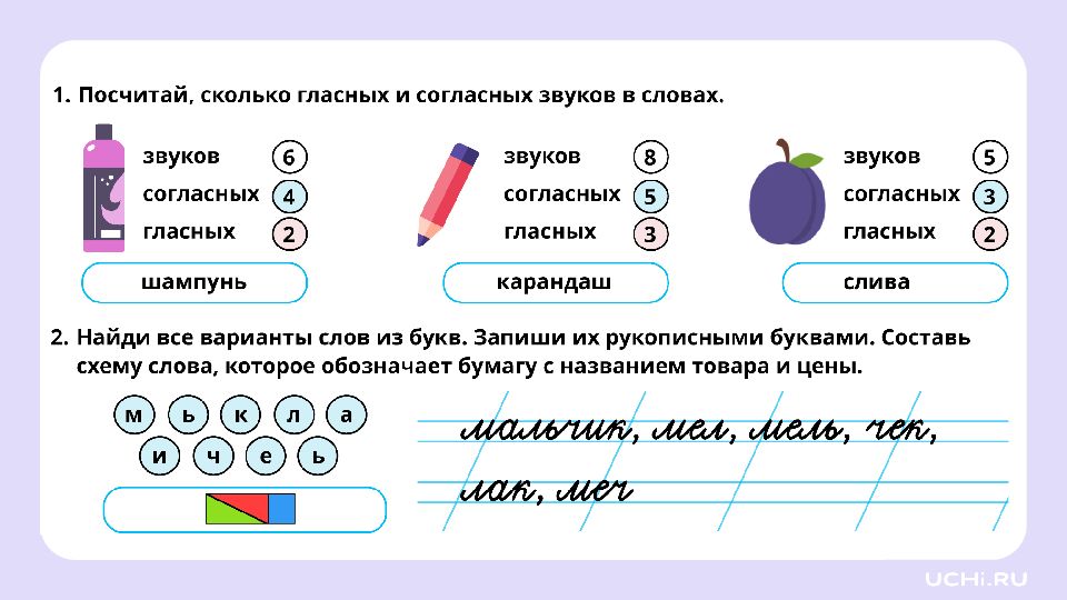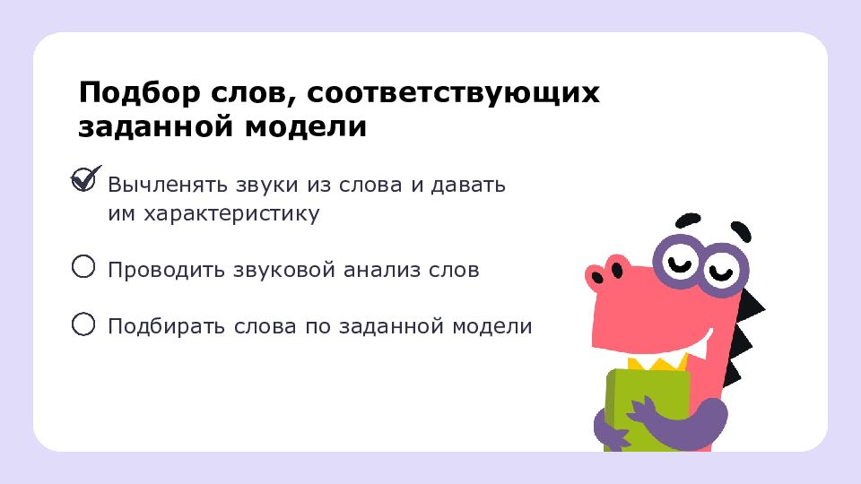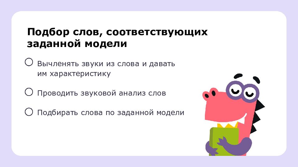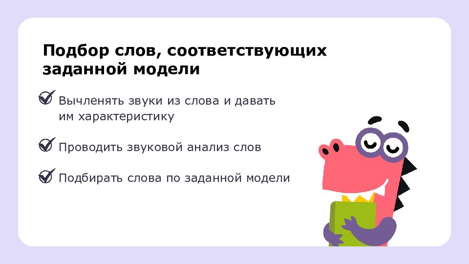 Подбор слов, соответствующих заданной модели Вычленять звуки из слова и давать им характеристику Проводить звуковой анализ слов Подбирать слова по заданной модели