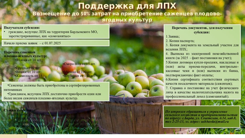 Получатели субсидии: граждане, ведущие ЛПХ на территории Бардымского МО, зарегистрированные, как « самозанятые » Поддержка для ЛПХ Возмещение до 50% затрат на приобретение саженцев плодово-ягодных культур Перечень саженцев плодово-ягодных культур: Яблоня от 10 шт.; Груша от 10 шт ; Вишня от 10 шт ; Жимолость от 15 шт.; Смородина от 15 шт. ; Малина от 100 шт ; Клубники от 150 шт. Ставки субсидии: Яблоня до 250 руб.; Груша до 300 руб.; Вишня до 200 руб.; Жимолость до 150 руб.; Смородина до 150 руб. Малина до 100 руб.; Клубники до 50 руб. Перечень документов, для получения субсидии: 1.Заявка; 2. Копия паспорта; 3. Копия документа на земельный участок для ведения ЛПХ; 4. Выписка из электронной похозяйственной книги (за 2025 - факт постановки на учет); 5.Копии договора купли-продажи, накладные и (или) акты приема-передачи, контрольно-кассовые чеки и (или) выписки из банка, подтверждающие факт оплаты; 6.Копии сертификата соответствия сортовых качеств посадочного материала (саженцев); 7. Справка о постановке на учет физического лица в качестве налогоплательщика налога на профессиональный доход ( самозанятый ). По вопросам обращаться в управление сельского хозяйства и предпринимательства по адресу: с.Барда, ул. Советская, д.14, каб.8, тел 2-25-13, эл. адрес: ushbarda@mail.ru Начало приема заявок – с 01.07.2025 Саженцы должны быть приобретены в сертифицированных питомниках Гражданам, ведущим ЛПХ достаточно приобрести один или более видов саженцев плодово-ягодных культур.