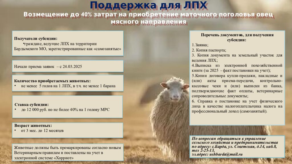 Получатели субсидии: граждане, ведущие ЛПХ на территории Бардымского МО, зарегистрированные как « самозанятые » Поддержка для ЛПХ Возмещение до 40 % затрат на приобретение маточного поголовья овец мясного направления Перечень документов, для получения субсидии: 1.Заявка; 2. Копия паспорта; 3. Копия документа на земельный участок для ведения ЛПХ; 4.Выписка из электронной похозяйственной книги (за 2025 - факт постановки на учет); 5.Копии договора купли-продажи, накладные и (или) акты приема-передачи, контрольно-кассовые чеки и (или) выписки из банка, подтверждающие факт оплаты, ветеринарные сопроводительные документы; 6. Справка о постановке на учет физического лица в качестве налогоплательщика налога на профессиональный доход ( самозанятый ). Возраст животных: от 3 мес. до 12 месяцев Количество приобретаемых животных: не менее 5 голов на 1 ЛПХ, в т.ч. не менее 1 барана Ставка субсидии: до 12 000 руб. но не более 40% на 1 голову МРС Животные должны быть промаркированы согласно новым Ветеринарным правилам и поставлены на учет в электронной системе « Хорриот » По вопросам обращаться в управление сельского хозяйства и предпринимательства по адресу: с.Барда, ул. Советская, д.14, каб.8, тел 2-25-13, эл.адрес : ushbarda@mail.ru Начало приема заявок – с 24.03.2025
