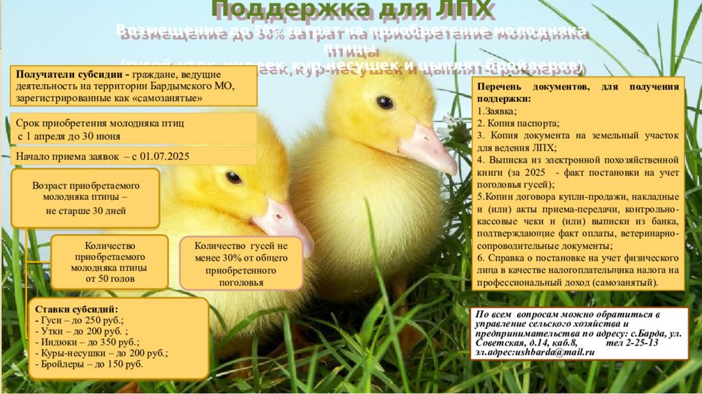 Поддержка для ЛПХ Возмещение до 50% затрат на приобретение молодняка птицы (гусей, уток, индеек, кур-несушек и цыплят-бройлеров) Перечень документов, для получения поддержки: 1.Заявка; 2. Копия паспорта; 3. Копия документа на земельный участок для ведения ЛПХ; 4. Выписка из электронной похозяйственной книги (за 2025 - факт постановки на учет поголовья гусей); 5.Копии договора купли-продажи, накладные и (или) акты приема-передачи, контрольно-кассовые чеки и (или) выписки из банка, подтверждающие факт оплаты, ветеринарно-сопроводительные документы; 6. Справка о постановке на учет физического лица в качестве налогоплательщика налога на профессиональный доход ( самозанятый ). Получатели субсидии - граждане, ведущие деятельность на территории Бардымского МО, зарегистрированные как «самозанятые» По всем вопросам можно обратиться в управление сельского хозяйства и предпринимательства по адресу: с.Барда, ул. Советская, д.14, каб.8, тел 2-25-13 эл.адрес : ushbarda@mail.ru Количество гусей не менее 30% от общего приобретенного поголовья Срок приобретения молодняка птиц с 1 апреля до 30 июня Начало приема заявок – с 01.07.2025
