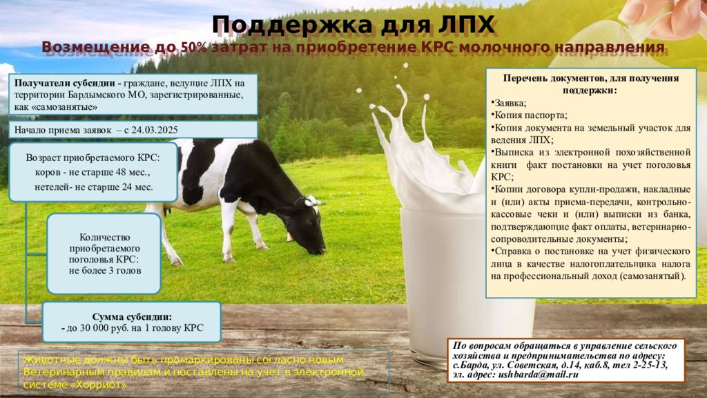 Поддержка для ЛПХ Возмещение до 50% затрат на приобретение КРС молочного направления Получатели субсидии - граждане, ведущие ЛПХ на территории Бардымского МО, зарегистрированные, как « самозанятые » Перечень документов, для получения поддержки: Заявка; Копия паспорта; Копия документа на земельный участок для ведения ЛПХ; Выписка из электронной похозяйственной книги факт постановки на учет поголовья КРС; Копии договора купли-продажи, накладные и (или) акты приема-передачи, контрольно-кассовые чеки и (или) выписки из банка, подтверждающие факт оплаты, ветеринарно-сопроводительные документы; Справка о постановке на учет физического лица в качестве налогоплательщика налога на профессиональный доход ( самозанятый ). По вопросам обращаться в управление сельского хозяйства и предпринимательства по адресу: с.Барда, ул. Советская, д.14, каб.8, тел 2-25-13, эл. адрес: ushbarda@mail.ru Животные должны быть промаркированы согласно новым Ветеринарным правилам и поставлены на учет в электронной системе « Хорриот » Начало приема заявок – с 24.03.2025