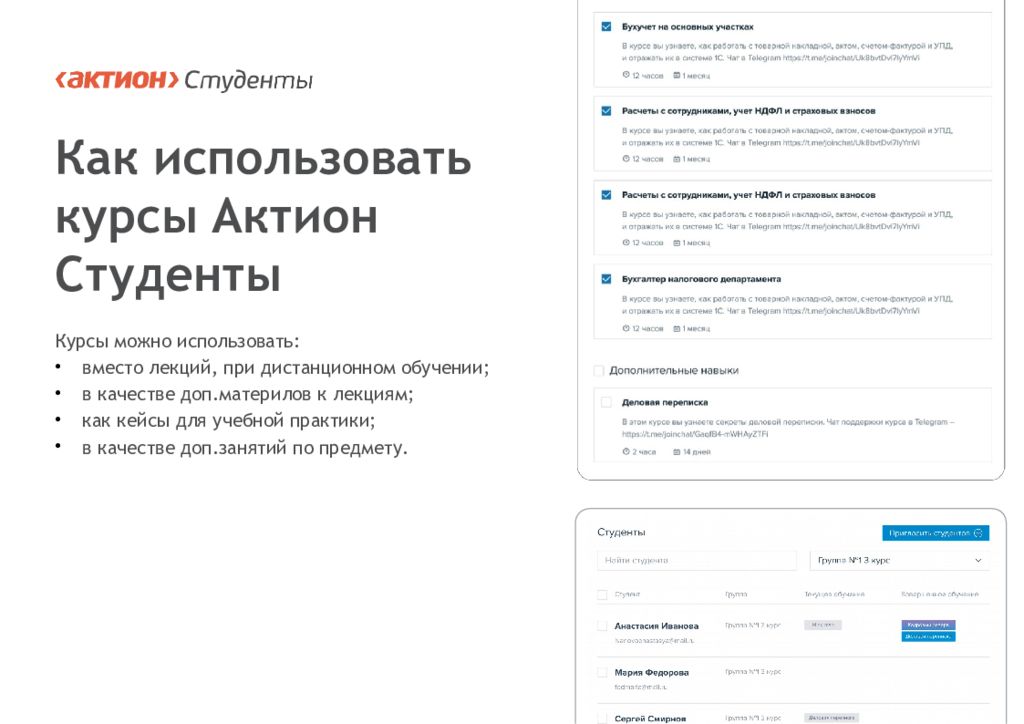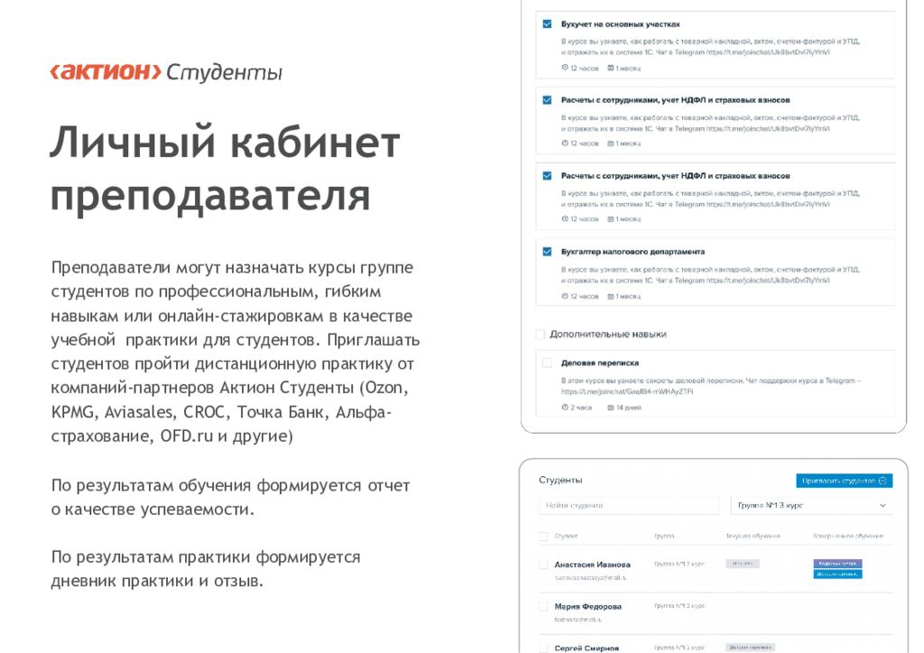 Преподаватели могут назначать курсы группе студентов по профессиональным, гибким навыкам или онлайн-стажировкам в качестве учебной практики для студентов. Приглашать студентов пройти дистанционную практику от компаний-партнеров Актион Студенты ( Ozon, KPMG, Aviasales, CROC, Точка Банк, Альфа-страхование, OFD.ru и другие) По результатам обучения формируется отчет о качестве успеваемости. По результатам практики формируется дневник практики и отзыв.