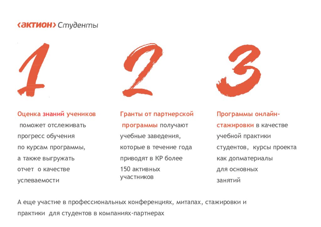 А еще участие в профессиональных конференциях, митапах, стажировки и практики для студентов в компаниях-партнерах Гранты от партнерской программы получают учебные заведения, которые в течение года приводят в КР более 150 активных участников Оценка знаний учеников поможет отслеживать прогресс обучения по курсам программы, а также выгружать отчет о качестве успеваемости Программы онлайн- стажировки в качестве учебной практики студентов, курсы проекта как допматериалы для основных занятий