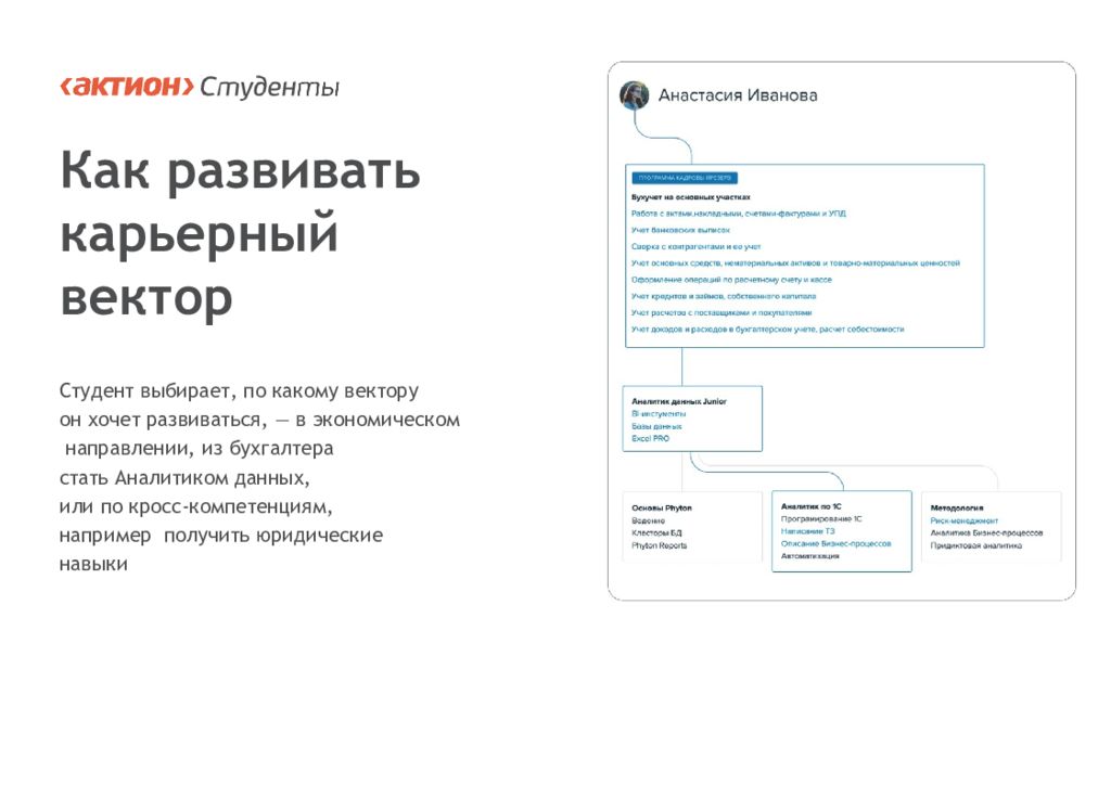 Студент выбирает, по какому вектору он хочет развиваться, — в экономическом направлении, из бухгалтера стать Аналитиком данных, или по кросс-компетенциям, например получить юридические навыки