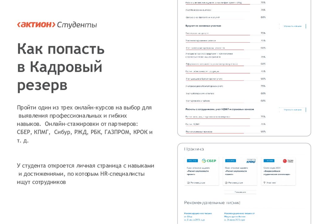 Пройти один из трех онлайн-курсов на выбор для выявления профессиональных и гибких навыков. Онлайн-стажировки от партнеров: СБЕР, КПМГ, Сибур, РЖД, РБК, ГАЗПРОМ, КРОК и т. д. У студента откроется личная страница с навыками и достижениями, по которым HR-специалисты ищут сотрудников