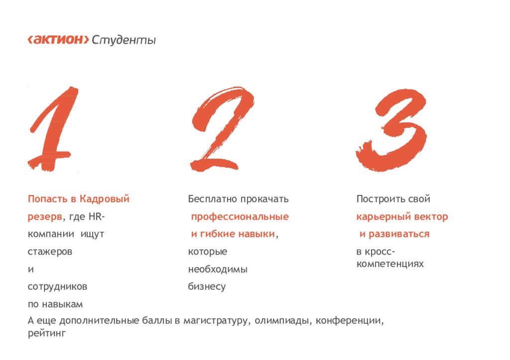 А еще дополнительные баллы в магистратуру, олимпиады, конференции, рейтинг Бесплатно прокачать профессиональные и гибкие навыки, которые необходимы бизнесу Попасть в Кадровый резерв, где HR-компании ищут стажеров и сотрудников по навыкам Построить свой карьерный вектор и развиваться в кросс-компетенциях