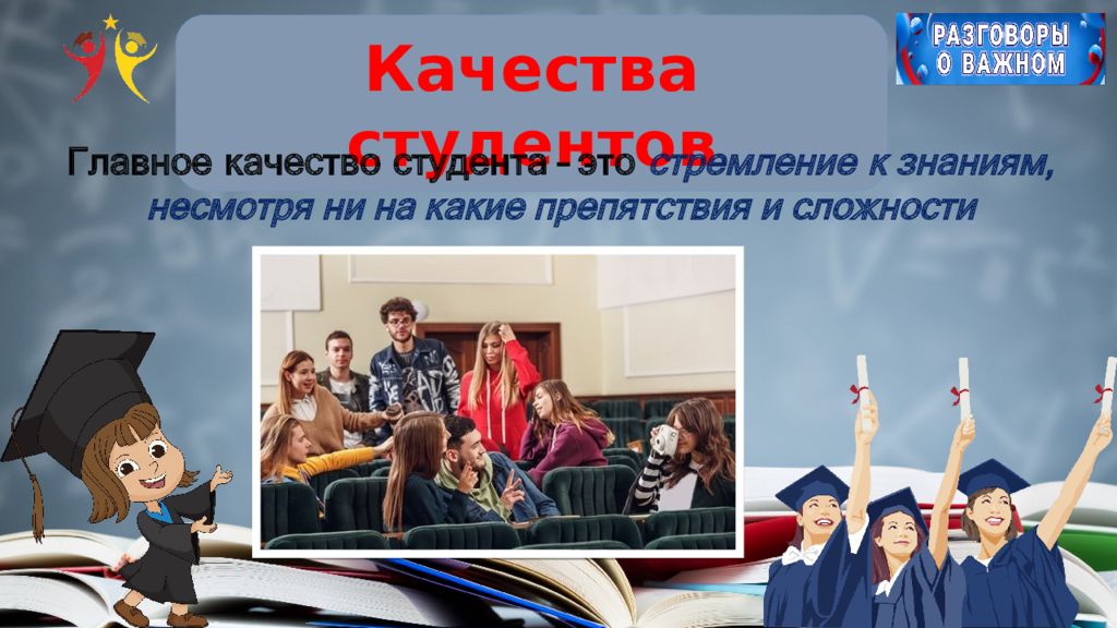 Качества студентов Главное качество студента – это стремление к знаниям, несмотря ни на какие препятствия и сложности