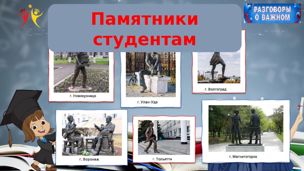 г. Воронеж г. Улан- Удэ г. Волгоград г. Магнитогорск г. Тольятти г. Новокузнецк Памятники студентам