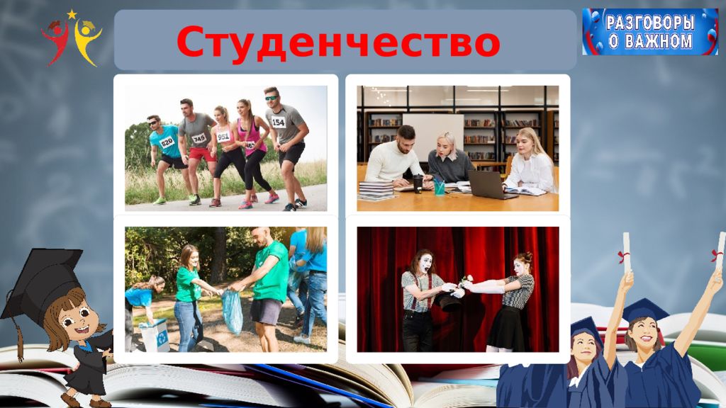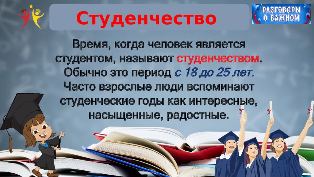 Студенчество Время, когда человек является студентом, называют студенчеством. Обычно это период с 18 до 25 лет. Часто взрослые люди вспоминают студенческие годы как интересные, насыщенные, радостные.