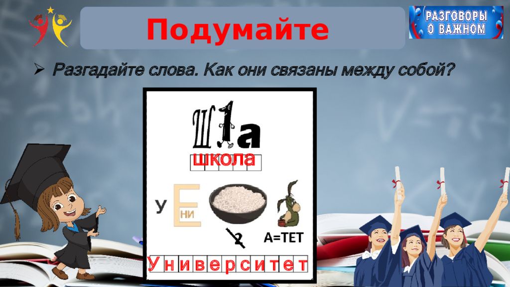 Подумайте Разгадайте слова. Как они связаны между собой? школа У н и в е р с и т е т