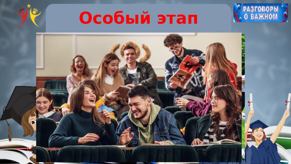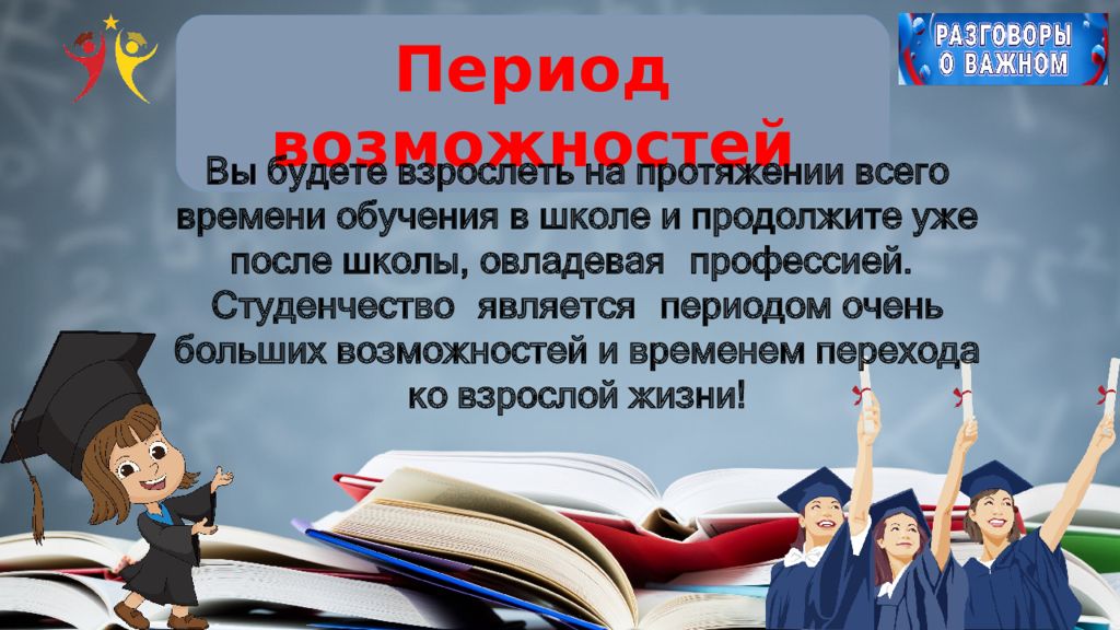Период возможностей Вы будете взрослеть на протяжении всего времени обучения в школе и продолжите уже после школы, овладевая профессией. Студенчество является периодом очень больших возможностей и временем перехода ко взрослой жизни!