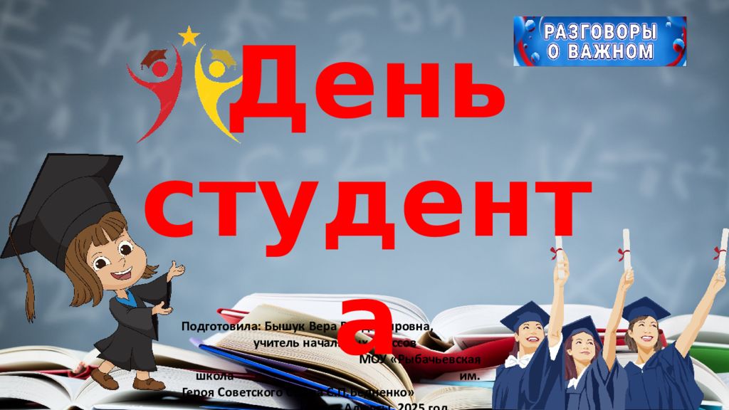 Подготовила: Бышук Вера Владимировна, учитель начальных классов МОУ « Рыбачьевская школа им. Героя Советского Союза С.П.Бедненко » города Алушты 2025 год День студента