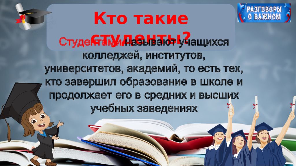 Кто такие студенты? Студентами называют учащихся колледжей, институтов, университетов, академий, то есть тех, кто завершил образование в школе и продолжает его в средних и высших учебных заведениях