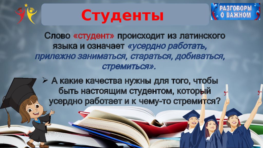 Студенты Слово «студент» происходит из латинского языка и означает «усердно работать, прилежно заниматься, стараться, добиваться, стремиться». А какие качества нужны для того, чтобы быть настоящим студентом, который усердно работает и к чему-то стремится?
