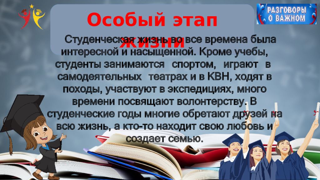 Особый этап жизни Студенческая жизнь во все времена была интересной и насыщенной. Кроме учебы, студенты занимаются спортом, играют в самодеятельных театрах и в КВН, ходят в походы, участвуют в экспедициях, много времени посвящают волонтерству. В студенческие годы многие обретают друзей на всю жизнь, а кто-то находит свою любовь и создает семью.