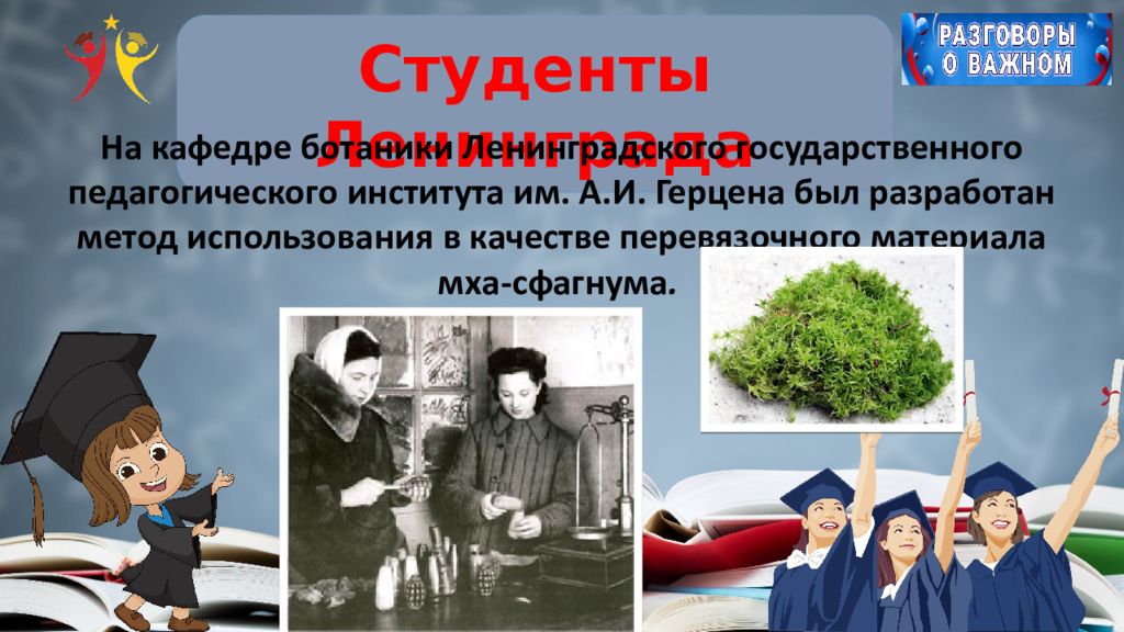 Студенты Ленинграда Н а кафедре ботаники Ленинградского государственного педагогического института им. А.И. Герцена был разработан метод использования в качестве перевязочного материала мха-сфагнума.