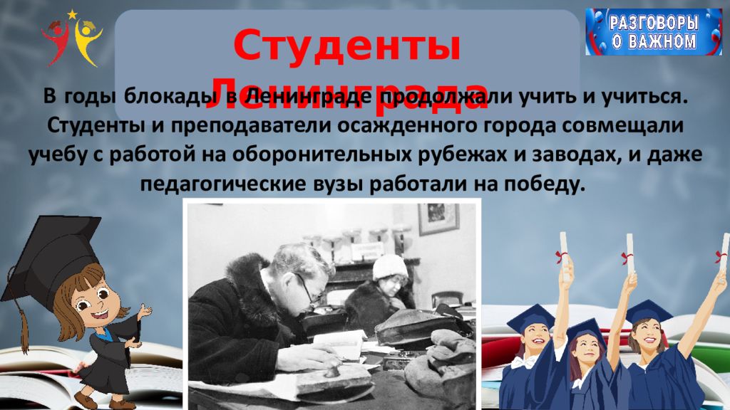 Студенты Ленинграда В годы блокады в Ленинграде продолжали учить и учиться. Студенты и преподаватели осажденного города совмещали учебу с работой на оборонительных рубежах и заводах, и даже педагогические вузы работали на победу.