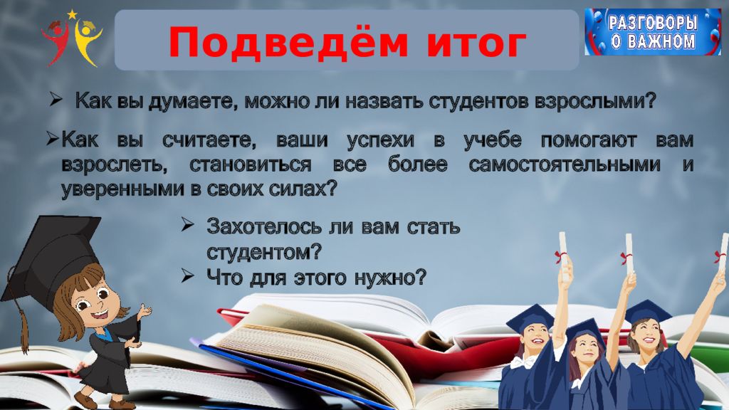 Подведём итог Как вы думаете, можно ли назвать студентов взрослыми? Как вы считаете, ваши успехи в учебе помогают вам взрослеть, становиться все более самостоятельными и уверенными в своих силах? Захотелось ли вам стать студентом? Что для этого нужно?