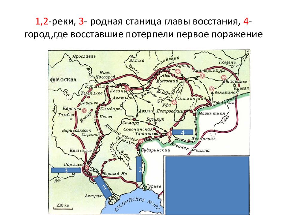 Слайд 16: 1,2 -реки, 3 - родная станица главы восстания, 4 - город,где восставшие потерпели первое поражение