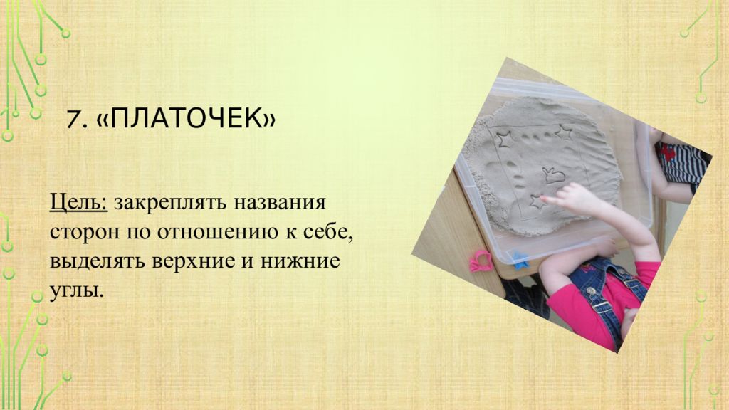 7. «ПЛАТОЧЕК» Цель: закреплять названия сторон по отношению к себе, выделять верхние и нижние углы.