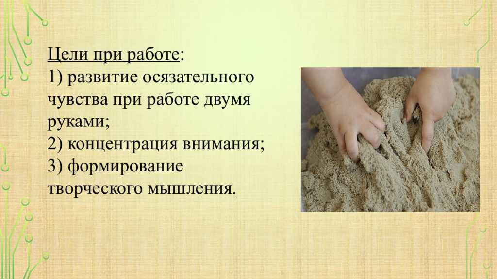 Цели при работе : 1) развитие осязательного чувства при работе двумя руками; 2) концентрация внимания; 3) формирование творческого мышления.