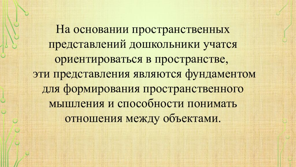 На основании пространственных представлений дошкольники учатся ориентироваться в пространстве, эти представления являются фундаментом для формирования пространственного мышления и способности понимать отношения между объектами.
