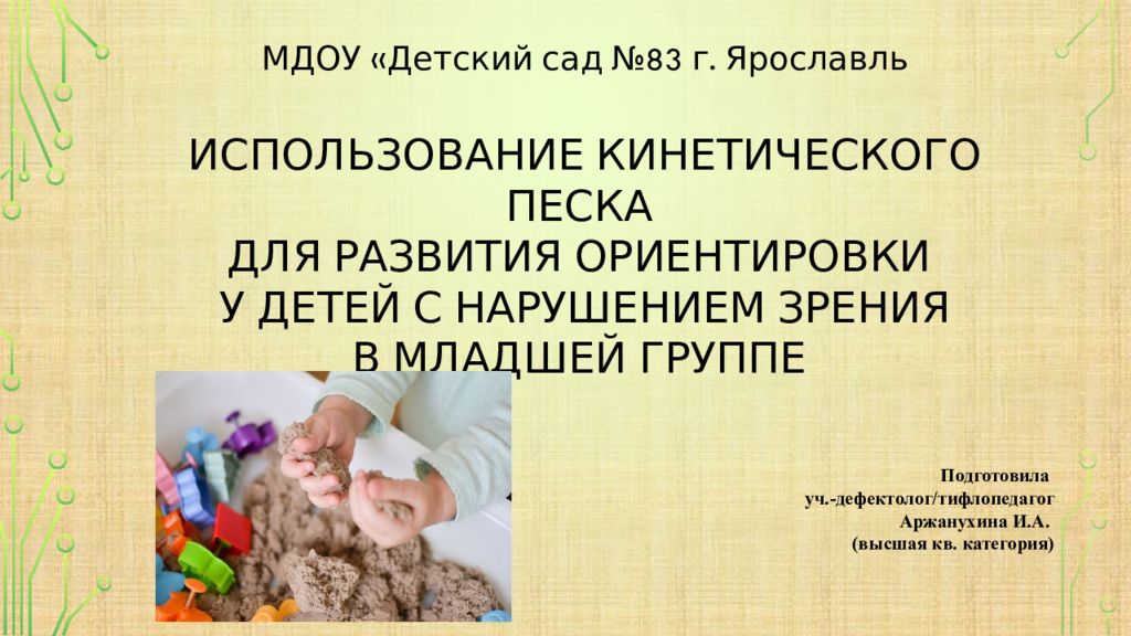 Подготовила уч.-дефектолог/тифлопедагог Аржанухина И.А. (высшая кв. категория) МДОУ «Детский сад №83 г. Ярославль ИСПОЛЬЗОВАНИЕ КИНЕТИЧЕСКОГО ПЕСКА ДЛЯ РАЗВИТИЯ ОРИЕНТИРОВКИ У ДЕТЕЙ С НАРУШЕНИЕМ ЗРЕНИЯ В МЛАДШЕЙ ГРУППЕ