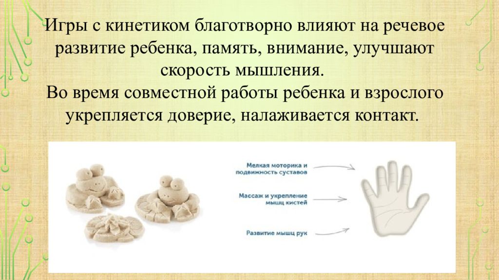 Игры с кинетиком благотворно влияют на речевое развитие ребенка, память, внимание, улучшают скорость мышления. Во время совместной работы ребенка и взрослого укрепляется доверие, налаживается контакт.