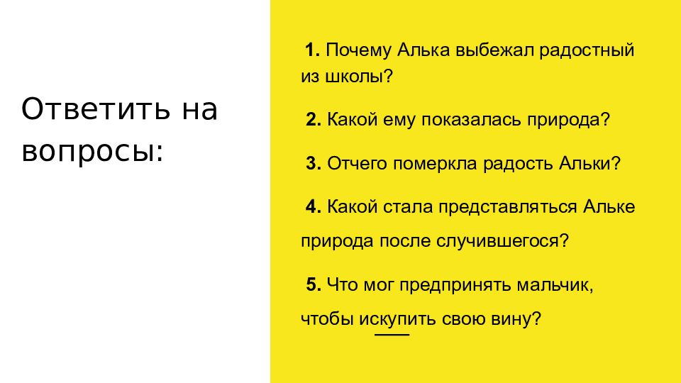 1. Почему Алька выбежал радостный из школы? 2. Какой ему показалась природа? 3. Отчего померкла радость Альки? 4. Какой стала представляться Альке природа после случившегося? 5. Что мог предпринять мальчик, чтобы искупить свою вину?