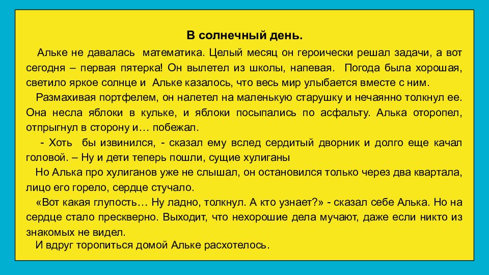 В солнечный день. Альке не давалась математика. Целый месяц он героически решал задачи, а вот сегодня – первая пятерка! Он вылетел из школы, напевая. Погода была хорошая, светило яркое солнце и Альке казалось, что весь мир улыбается вместе с ним. Размахивая портфелем, он налетел на маленькую старушку и нечаянно толкнул ее. Она несла яблоки в кульке, и яблоки посыпались по асфальту. Алька оторопел, отпрыгнул в сторону и… побежал. - Хоть бы извинился, - сказал ему вслед сердитый дворник и долго еще качал головой. – Ну и дети теперь пошли, сущие хулиганы Но Алька про хулиганов уже не слышал, он остановился только через два квартала, лицо его горело, сердце стучало. «Вот какая глупость… Ну ладно, толкнул. А кто узнает?» - сказал себе Алька. Но на сердце стало прескверно. Выходит, что нехорошие дела мучают, даже если никто из знакомых не видел. И вдруг торопиться домой Альке расхотелось.