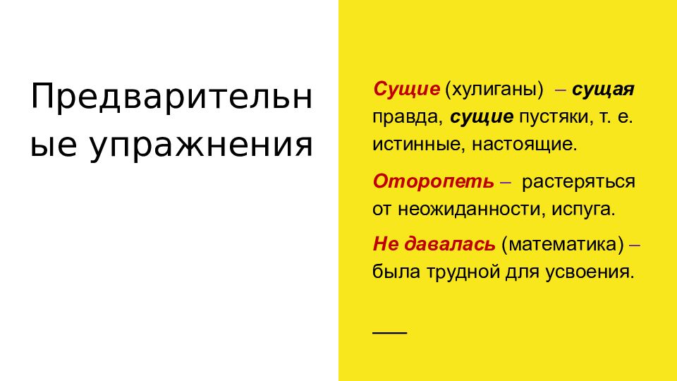 Сущие (хулиганы) – с ущая правда, сущие пустяки, т. е. истинные, настоящие. Оторопеть – растеряться от неожиданности, испуга. Не давалась (математика) – была трудной для усвоения.