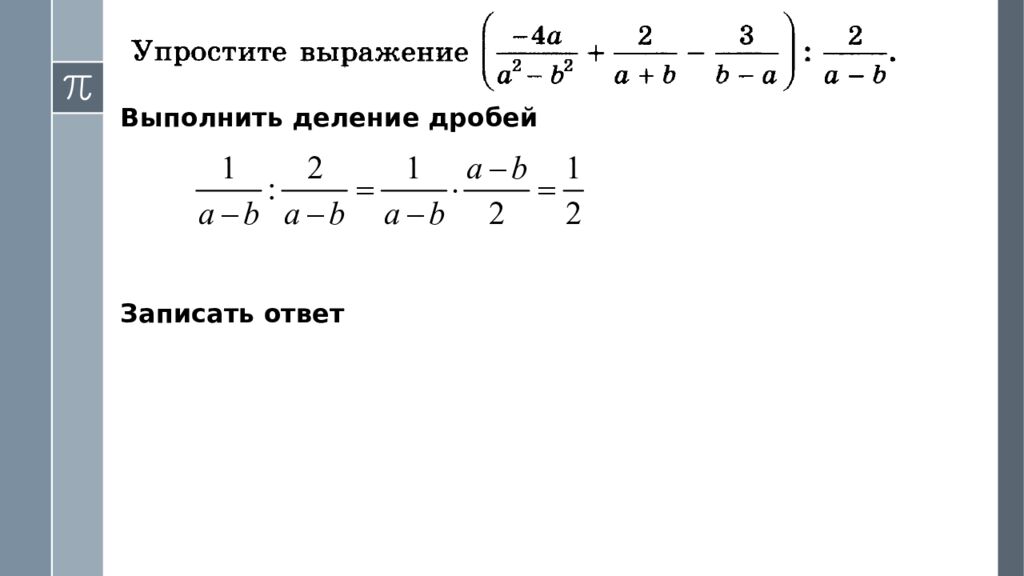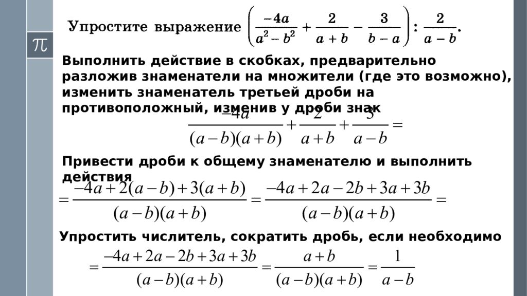Выполнить действие в скобках, предварительно разложив знаменатели на множители (где это возможно), изменить знаменатель третьей дроби на противоположный, изменив у дроби знак Привести дроби к общему знаменателю и выполнить действия Упростить числитель, сократить дробь, если необходимо
