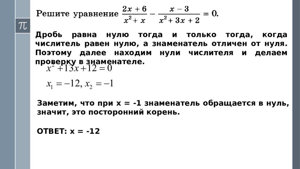 Дробь равна нулю тогда и только тогда, когда числитель равен нулю, а знаменатель отличен от нуля. Поэтому далее находим нули числителя и делаем проверку в знаменателе. Заметим, что при х = -1 знаменатель обращается в нуль, значит, это посторонний корень. ОТВЕТ: х = -12