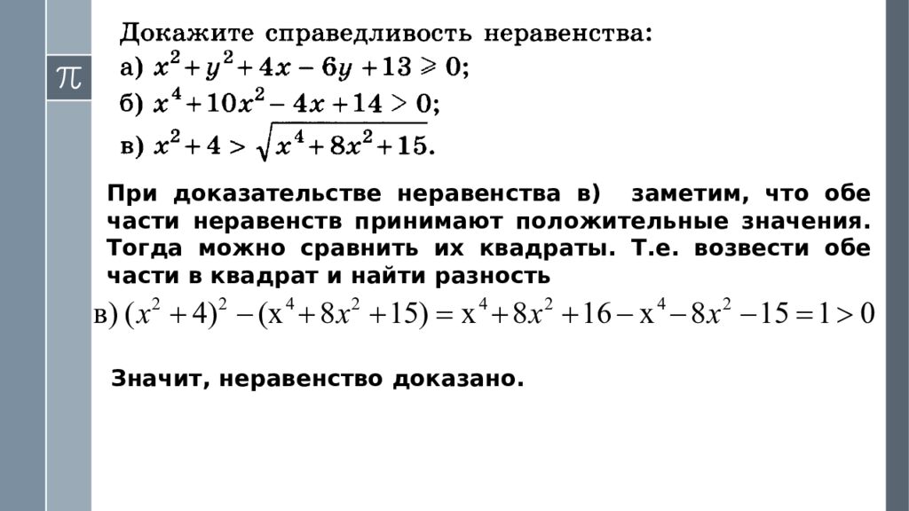 При доказательстве неравенства в) заметим, что обе части неравенств принимают положительные значения. Тогда можно сравнить их квадраты. Т.е. возвести обе части в квадрат и найти разность Значит, неравенство доказано.