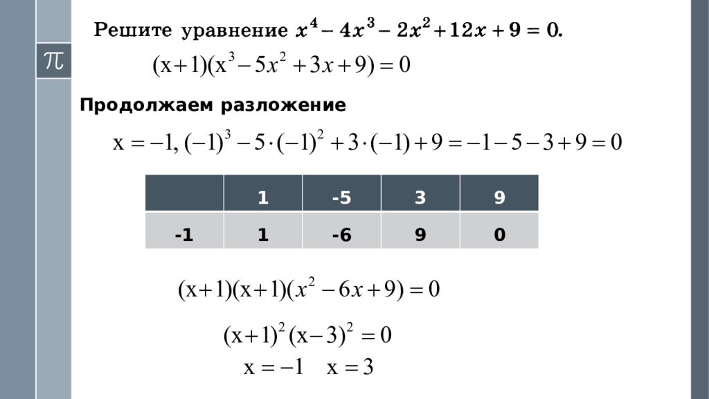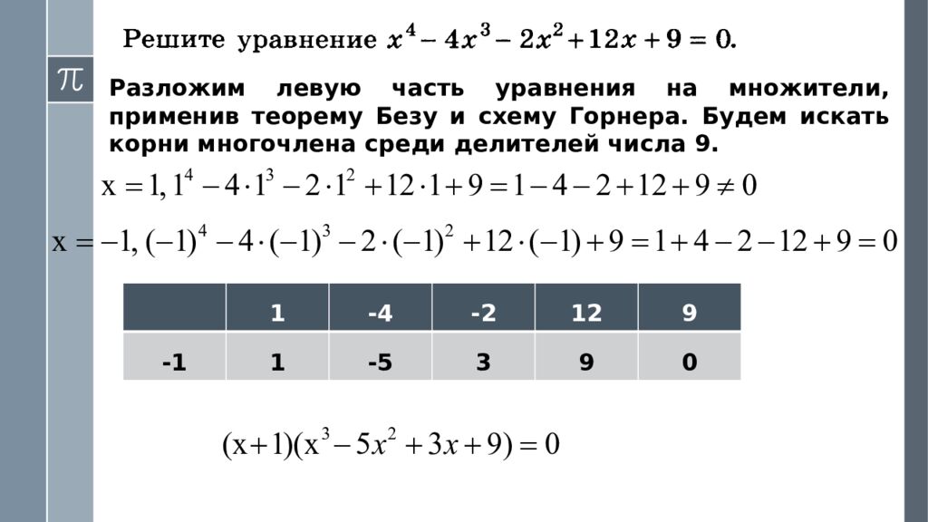 Разложим левую часть уравнения на множители, применив теорему Безу и схему Горнера. Будем искать корни многочлена среди делителей числа 9. 1 -4 -2 12 9 -1 1 -5 3 9 0