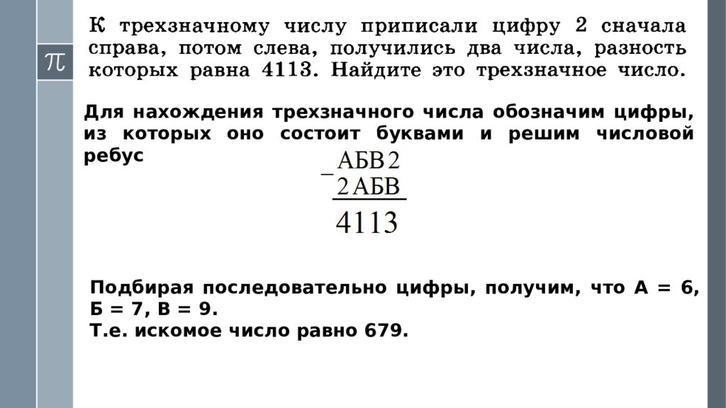 Для нахождения трехзначного числа обозначим цифры, из которых оно состоит буквами и решим числовой ребус Подбирая последовательно цифры, получим, что А = 6, Б = 7, В = 9. Т.е. искомое число равно 679.