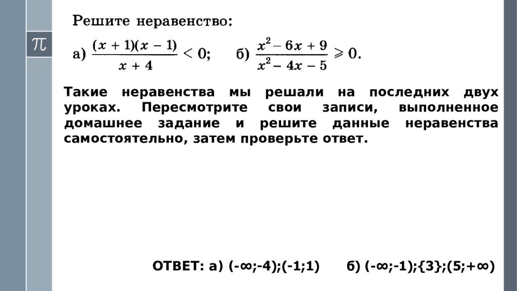 Такие неравенства мы решали на последних двух уроках. Пересмотрите свои записи, выполненное домашнее задание и решите данные неравенства самостоятельно, затем проверьте ответ. ОТВЕТ: а) (- ∞;-4);(-1;1) б) (- ∞ ;-1); {3} ;(5;+∞)