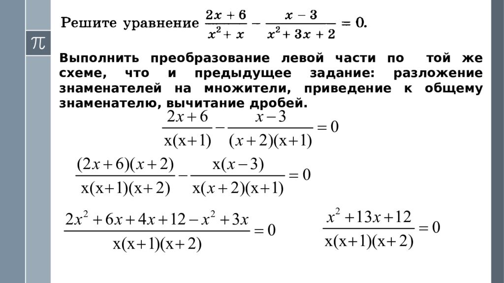 Выполнить преобразование левой части по той же схеме, что и предыдущее задание: разложение знаменателей на множители, приведение к общему знаменателю, вычитание дробей.