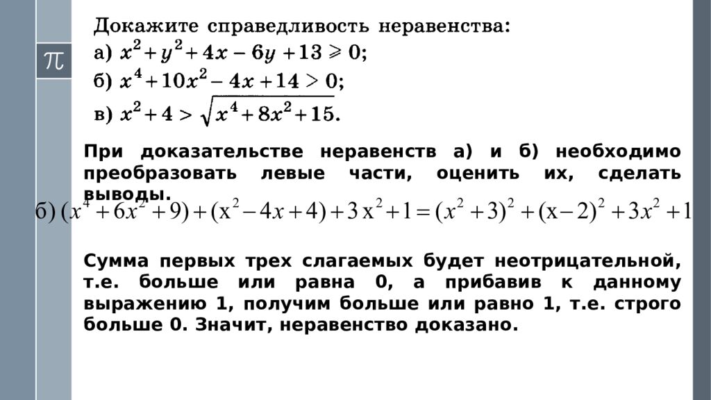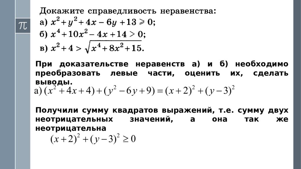 При доказательстве неравенств а) и б) необходимо преобразовать левые части, оценить их, сделать выводы. Получили сумму квадратов выражений, т.е. сумму двух неотрицательных значений, а она так же неотрицательна