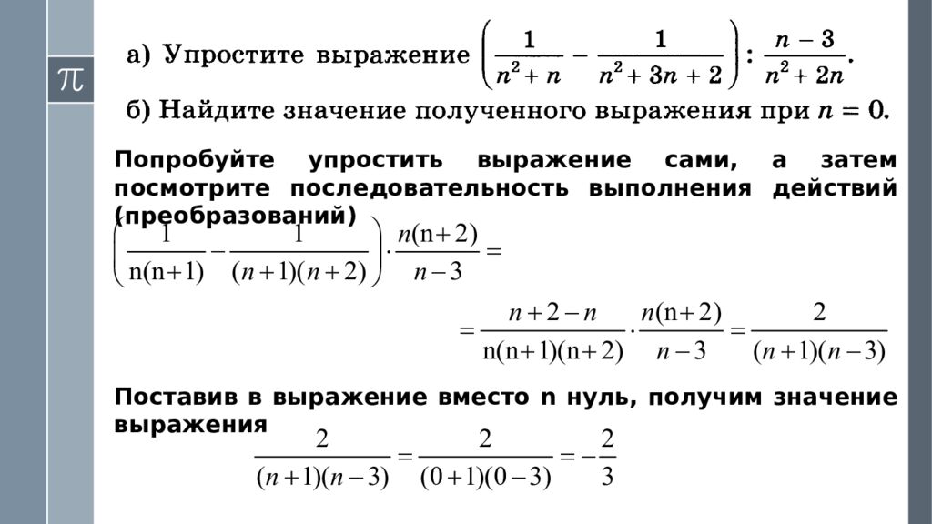 Попробуйте упростить выражение сами, а затем посмотрите последовательность выполнения действий (преобразований ) Поставив в выражение вместо n нуль, получим значение выражения
