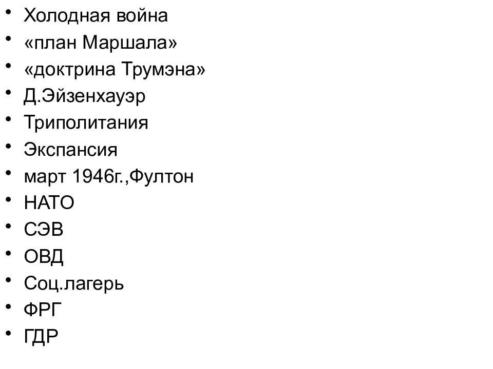 Холодная война «план Маршала» «доктрина Трумэна» Д.Эйзенхауэр Триполитания Экспансия март 1946г.,Фултон НАТО СЭВ ОВД Соц.лагерь ФРГ ГДР
