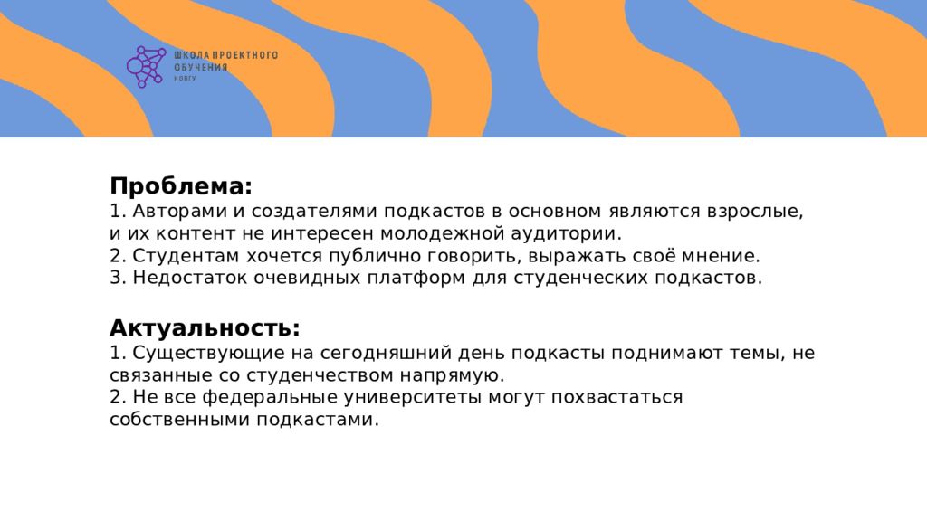 Проблема: 1. Авторами и создателями подкастов в основном являются взрослые, и их контент не интересен молодежной аудитории. 2. Студентам хочется публично говорить, выражать своё мнение. 3. Недостаток очевидных платформ для студенческих подкастов. Актуальность: 1. Существующие на сегодняшний день подкасты поднимают темы, не связанные со студенчеством напрямую. 2. Не все федеральные университеты могут похвастаться собственными подкастами.