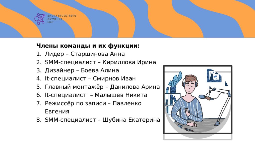 Члены команды и их функции : Лидер – Старшинова Анна SMM -специалист – Кириллова Ирина Дизайнер – Боева Алина It- специалист – Смирнов Иван Главный монтажёр – Данилова Арина It- специалист – Малышев Никита Режиссёр по записи – Павленко Евгения SMM -специалист – Шубина Екатерина