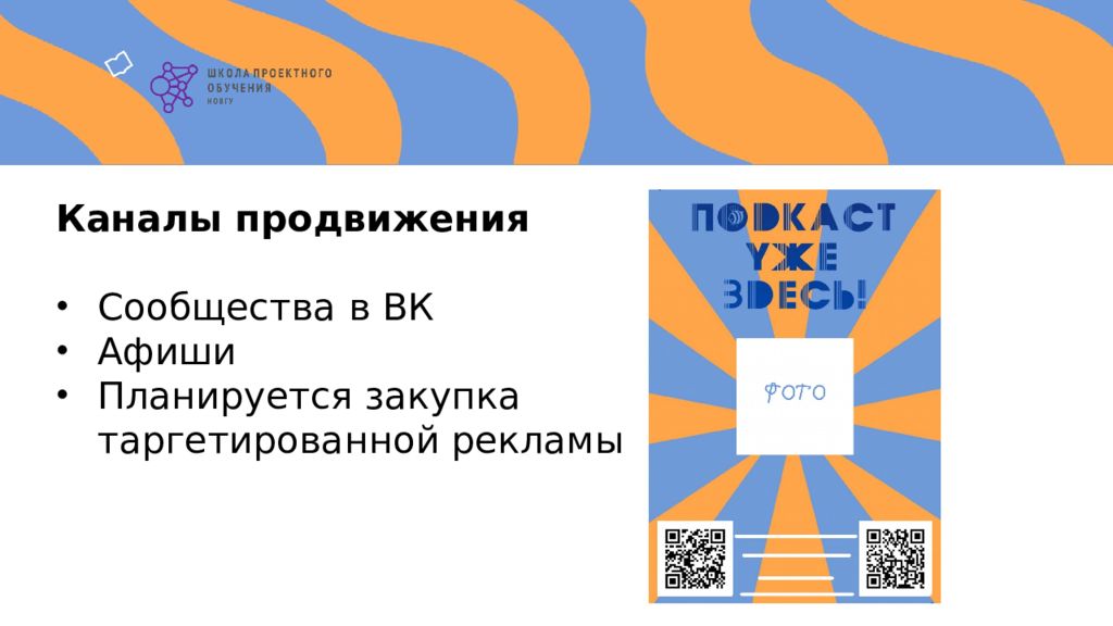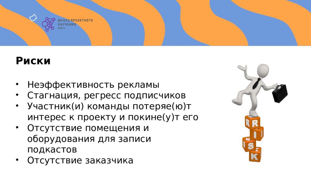 Риски Неэффективность рекламы Стагнация, регресс подписчиков Участник(и) команды потеряе (ю)т интерес к проекту и покине (у)т его Отсутствие помещения и оборудования для записи подкастов Отсутствие заказчика