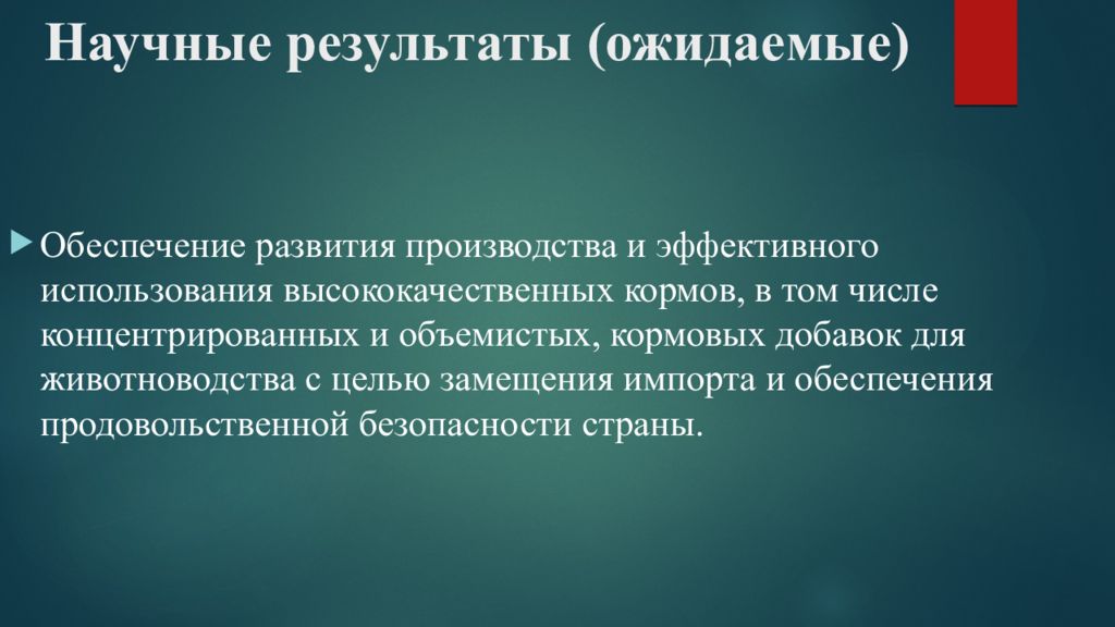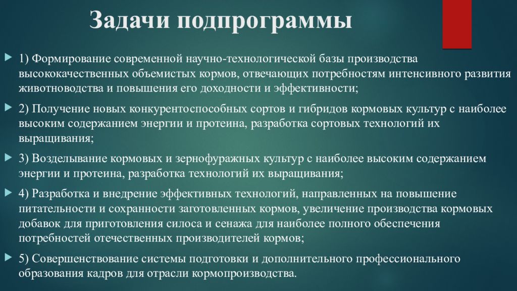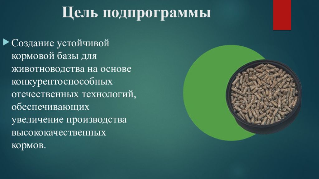 Создание устойчивой кормовой базы для животноводства на основе конкурентоспособных отечественных технологий, обеспечивающих увеличение производства высококачественных кормов.