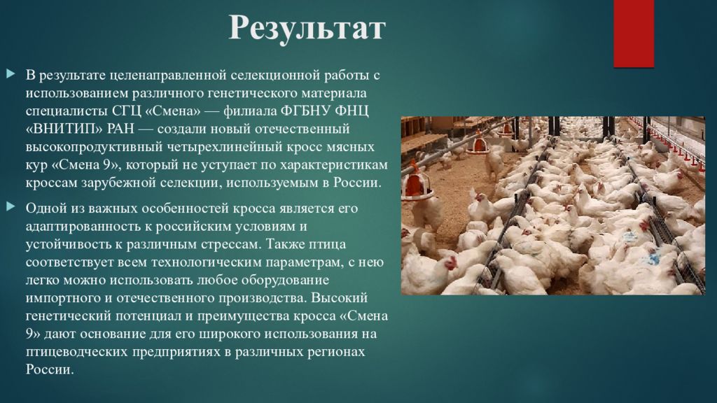 В результате целенаправленной селекционной работы с использованием различного генетического материала специалисты СГЦ «Смена» — филиала ФГБНУ ФНЦ «ВНИТИП» РАН — создали новый отечественный высокопродуктивный четырехлинейный кросс мясных кур «Смена 9», который не уступает по характеристикам кроссам зарубежной селекции, используемым в России. Одной из важных особенностей кросса является его адаптированность к российским условиям и устойчивость к различным стрессам. Также птица соответствует всем технологическим параметрам, с нею легко можно использовать любое оборудование импортного и отечественного производства. Высокий генетический потенциал и преимущества кросса «Смена 9» дают основание для его широкого использования на птицеводческих предприятиях в различных регионах России.